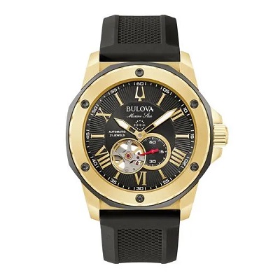 Bulova Marine Star vyriškas laikrodis – tai klasikinis laikrodis su palikimu, siekiančiu kelis dešimtmečius. Atviras „open heartbeat“ automatinis 21 akmens mechanizmas matomas tiek per ciferblato angą, tiek per permatomą galinį dangtelį. Aukso spalvos nerūdijančio plieno korpusas su juodais akcentais dera su juodu ciferblatu ir plokščiu mineraliniu stiklu. Juoda tekstūruota silikoninė apyrankė turi kontrastingą raudoną vidinę pusę, o 200 metrų atsparumas vandeniui pateisina laikrodžio vardą – tai laikrodis, galintis keliauti kartu su jumis bet kur, neprarasdamas ritmo.