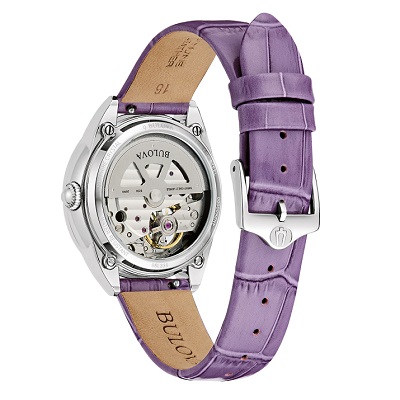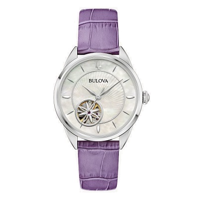 Išskirtinai rafinuotas ir laikui nepavaldus Bulova Sutton moteriškas automatinis laikrodis – stiliaus pareiškimas. 34 mm sidabrinės spalvos korpusas su išgaubtu safyro stiklu, levandų spalvos, krokodilo tekstūros odinė apyrankė. Perlamutrinis ciferblatas su saulės spindulių efektu, atvira gėlių formos anga atskleidžia 21 akmens automatinį mechanizmą su 42 val. galios rezervu. Elegancija, kuri nelieka nepastebėta.